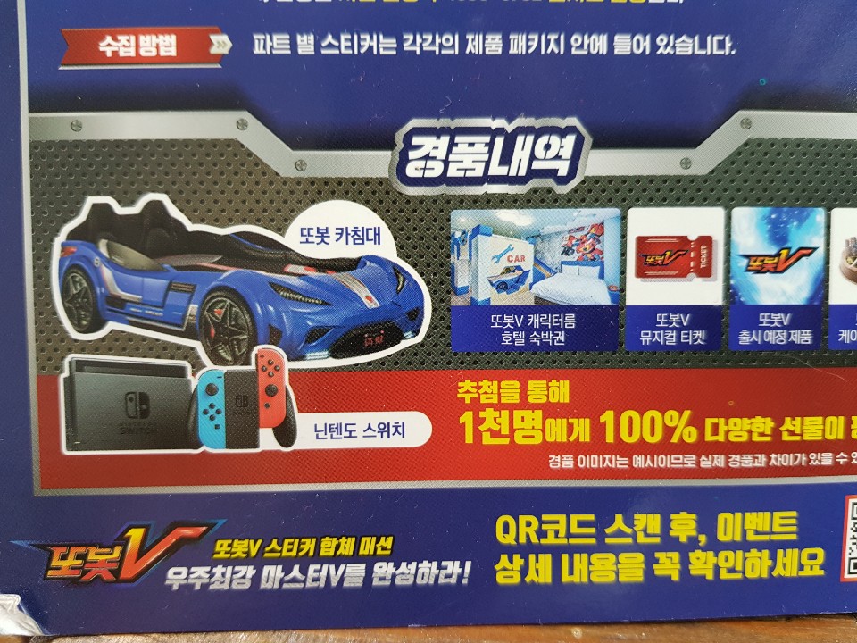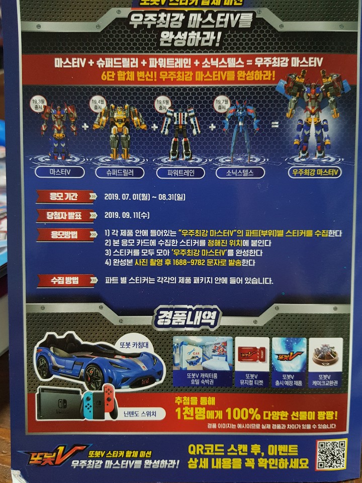 응모방법: 1.각제품 안에 들어 있는 우주최강 마스터V의 파트별 스티커를 수집한다